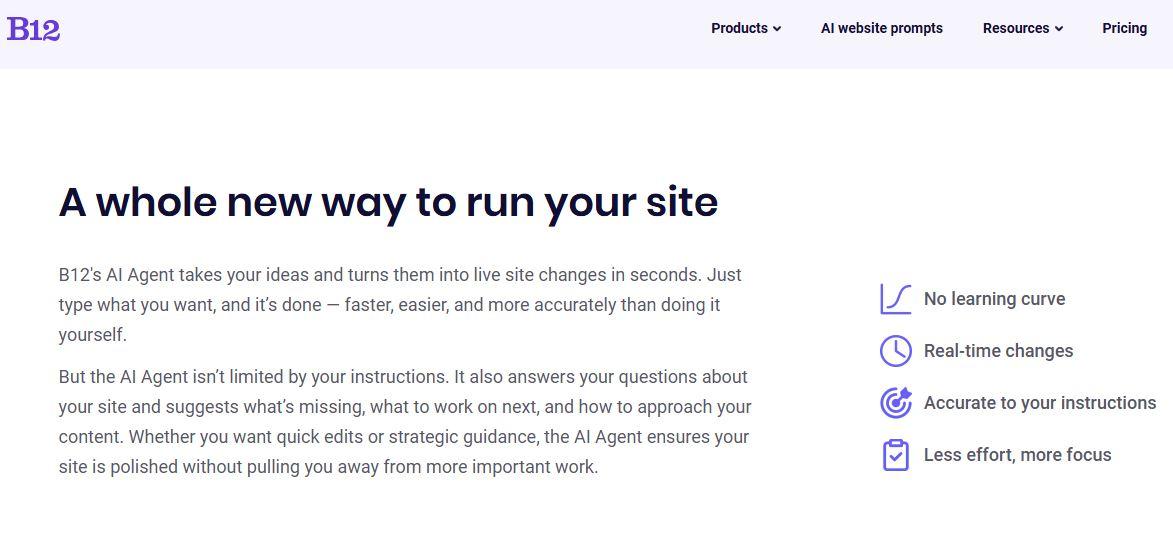 - With its AI-powered tools, you can refine your About page, update your color scheme, or make the messaging on your Home page crystal clear, even without the technical expertise. You can also get support from B12's in-house experts who are ready to step in with guidance.
