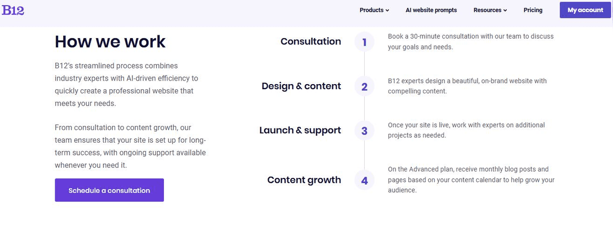 If you want, you can seek the creative services of B12’s team to review your draft. Their technical expertise helps refine everything from your About page to your Services page, keeping the focus on creating an effective site that builds trust with new clients. Many consultants also use this step to upgrade a current website with mobile-first design improvements, ensuring their online presence is polished and professional.