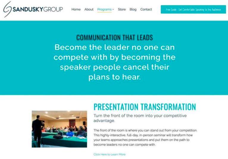 Design overview: The site is a great example as it incorporates blog integration and client testimonials to position the consultant as an expert. Clean sections break down services, frameworks, and processes in an easy-to-skim format.