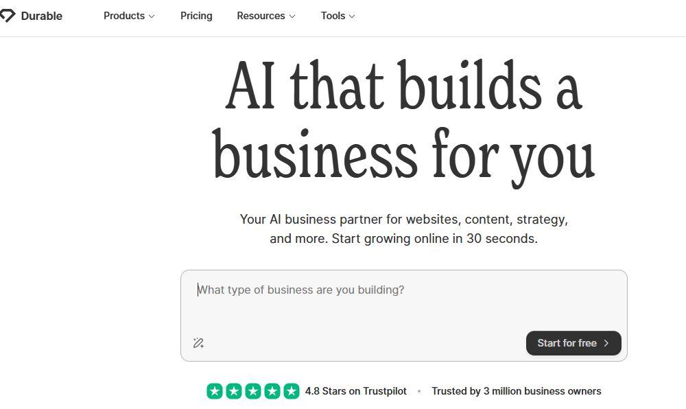 Durable is all about speed. It can generate either a full site or either a landing page in seconds with minimal input. Its streamlined approach allows users to launch campaigns without getting bogged down in design or coding.