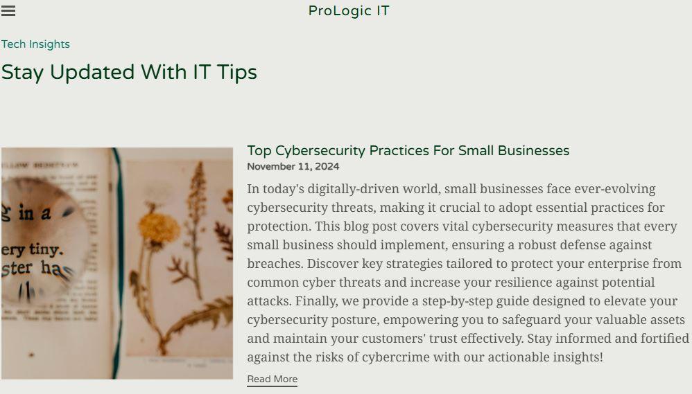 The combination of sans-serif and serif fonts, paired with a structured layout, reinforces ProLogic IT’s efficient and trustworthy brand image. The visual hierarchy supports fast comprehension and enhances scannability.