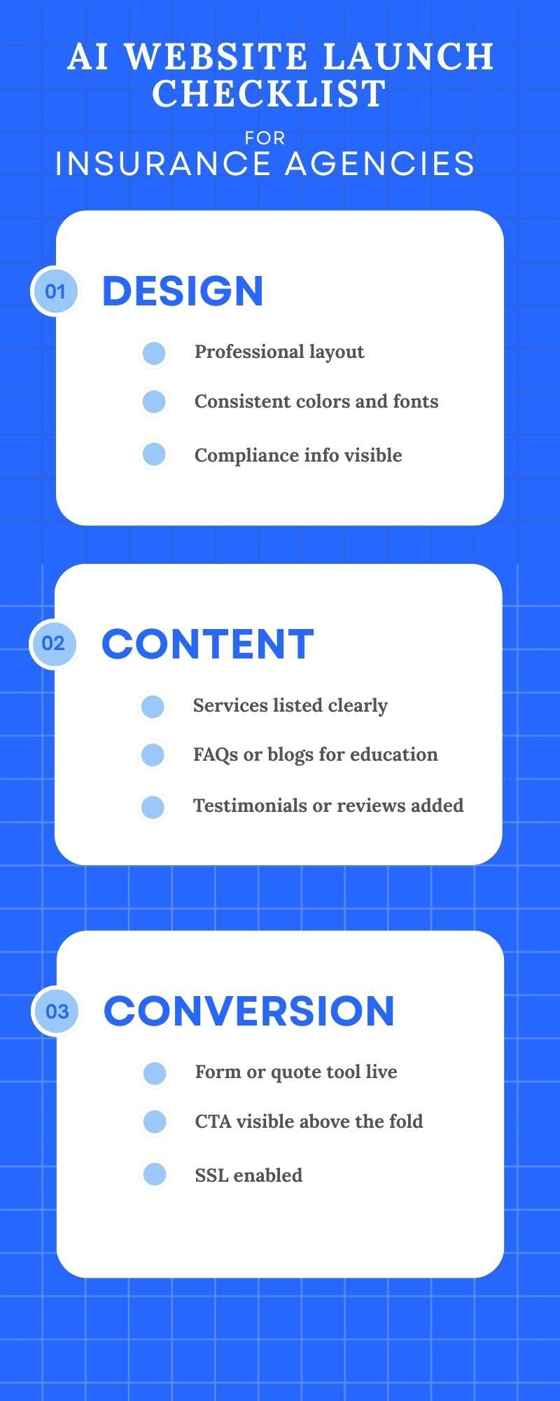 This infographic provides a checklist guide for insurance agencies before launching an AI website.