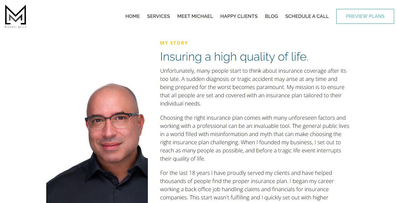 When buying insurance, people look for two important things: relatability and credibility. A solid “About Us” page, such as Michael Melle Insurance Group, shows real faces, credentials, and years of expertise, helping prospects feel like they’re dealing with someone legitimate, not just another site trying to sell online.