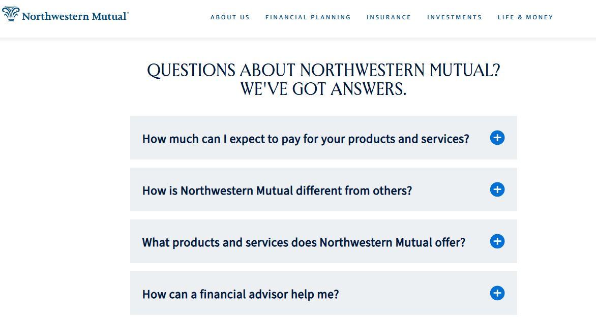 For instance, Northwestern Mutual Insurance’s FAQ section helps site visitors find the answers without needing to call or email.