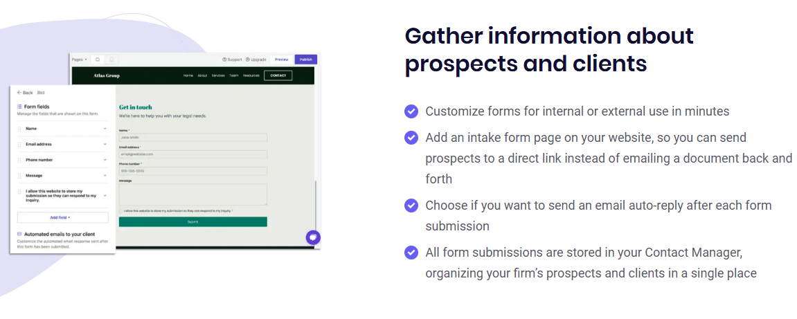 Use built-in integrations on your AI-generated mortgage website, such as contact forms, online scheduling, and intake forms. These add-ons help ease operational workflows, encourage and streamline client interactions, and help your site gain more leads.