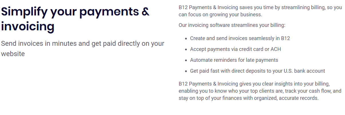 Collect fees directly through your website with B12’s built-in payment and invoicing gateways. You can accept service fees online and manage invoicing in the same place, streamlining the entire process. Everything runs smoothly on one platform, making things simple yet secure for both you and your clients.