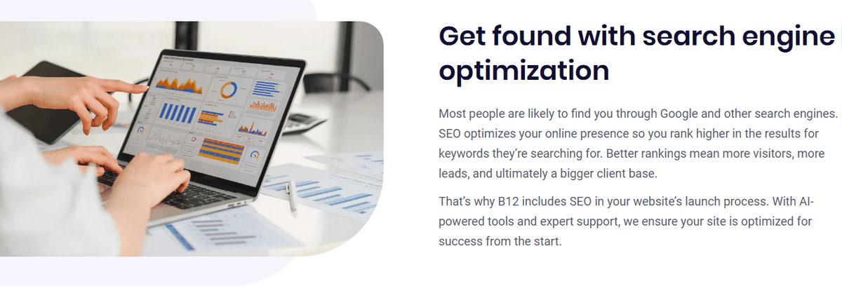 For your mortgage website to appear in search results, it needs to be optimized for platforms like Google. B12 integrates local SEO signals so potential clients in your area can easily discover your services. At the same time, your content stays aligned with financial compliance standards, helping you build trust and position yourself as a reliable authority in the industry.