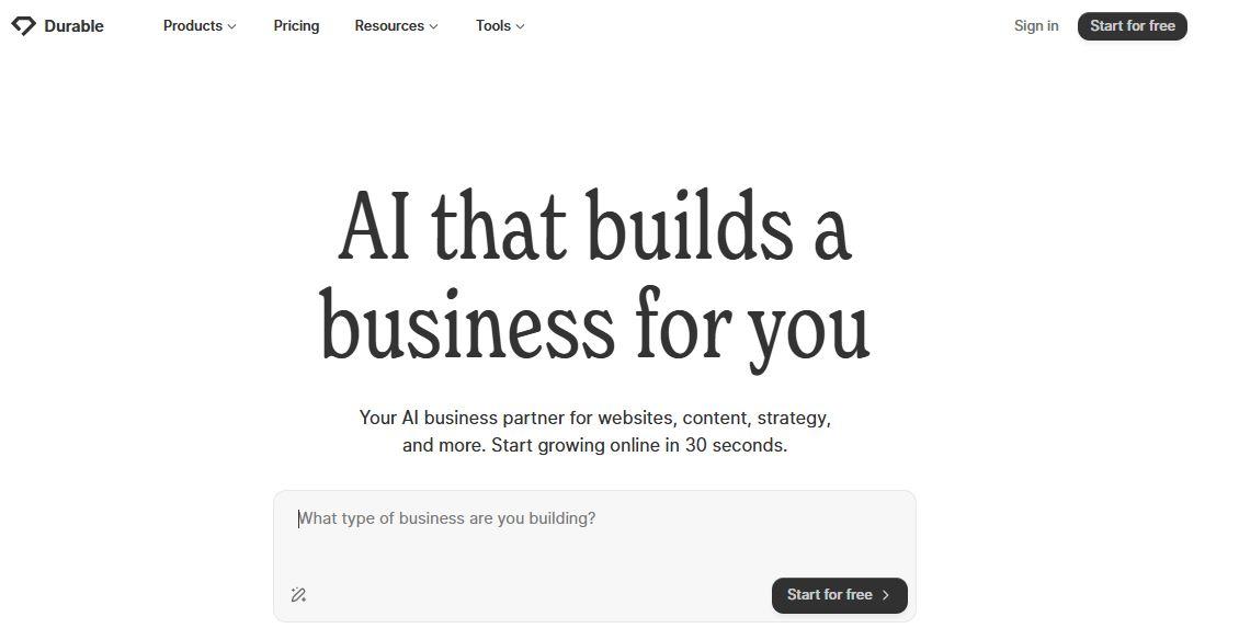 - Durable: This site builder focuses on ultra-fast site generation, creating a usable website in seconds with simple prompts. It’s best for beginners who want quick results but may need more customization later.