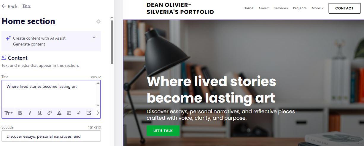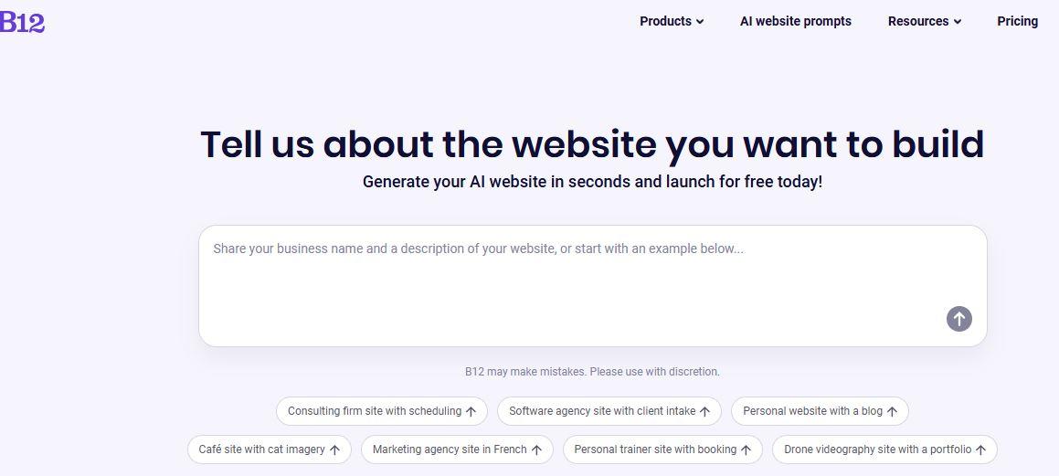 - B12: An AI website builder built specifically for professionals and small businesses, offering AI-generated website structures, on-brand copy, and built-in business tools. It’s ideal if you want a platform that grows with you and supports long-term use without switching platforms.