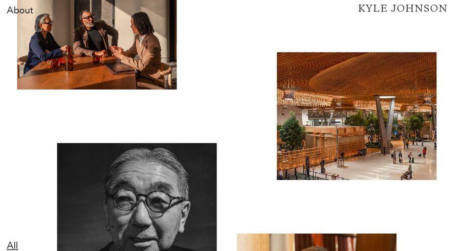 Kyle Johnson’s website has a two column grid-style gallery + short bio displayed in an overlay design.